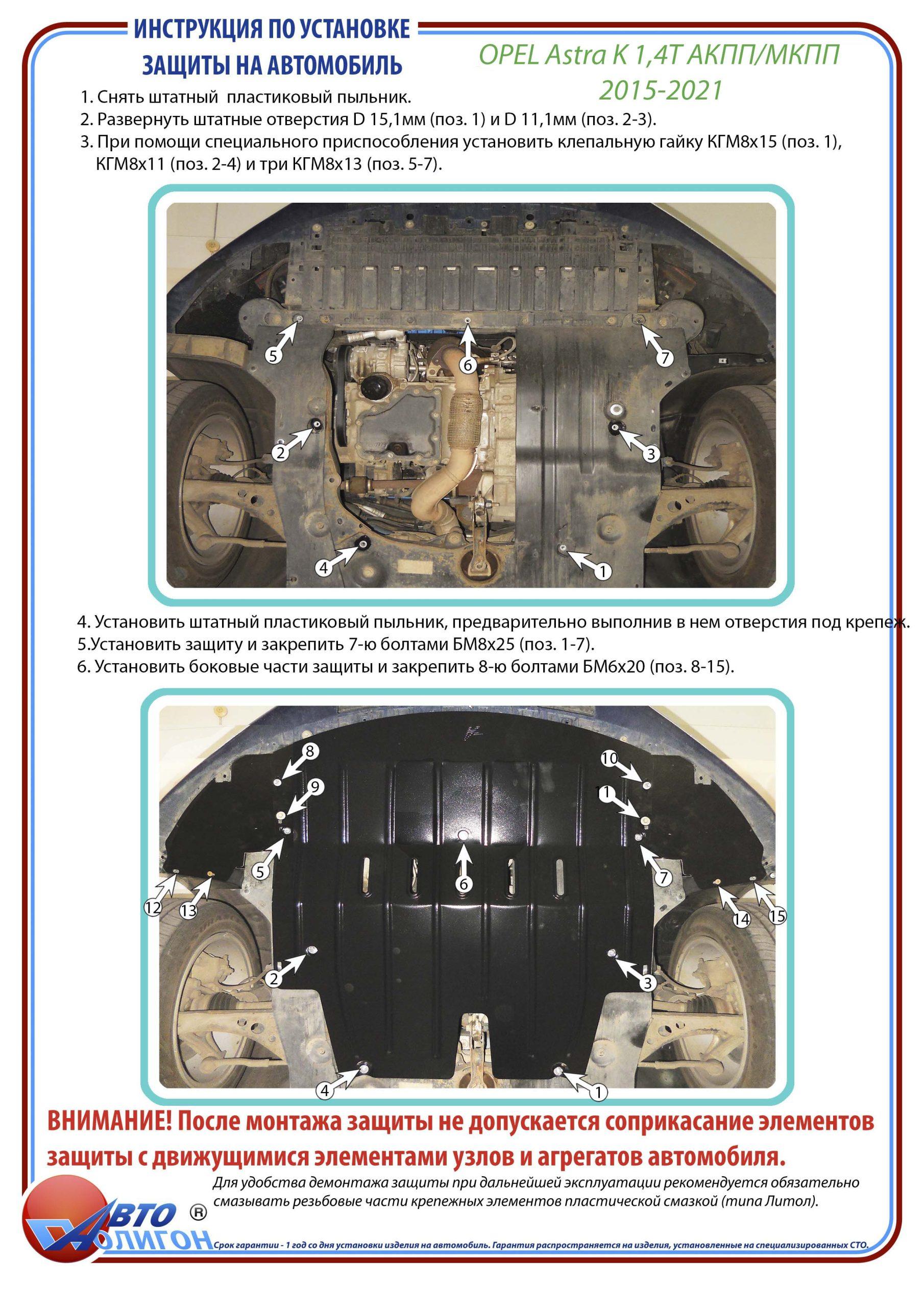 Цей захист двигуна індивідуально розроблений за параметрами моторного відсіку для автомобіля OPEL Astra K , модельного ряду років 2015 - 2021. Наприклад, якщо автомобіль випущений у 2015, 2016, 2017, 2018, 2019, 2020, 2021 роках, то можете бути упевнені, що цей захист двигуна підійде для Вашого автомобіля Astra K 1,4T АКПП/МКПП .