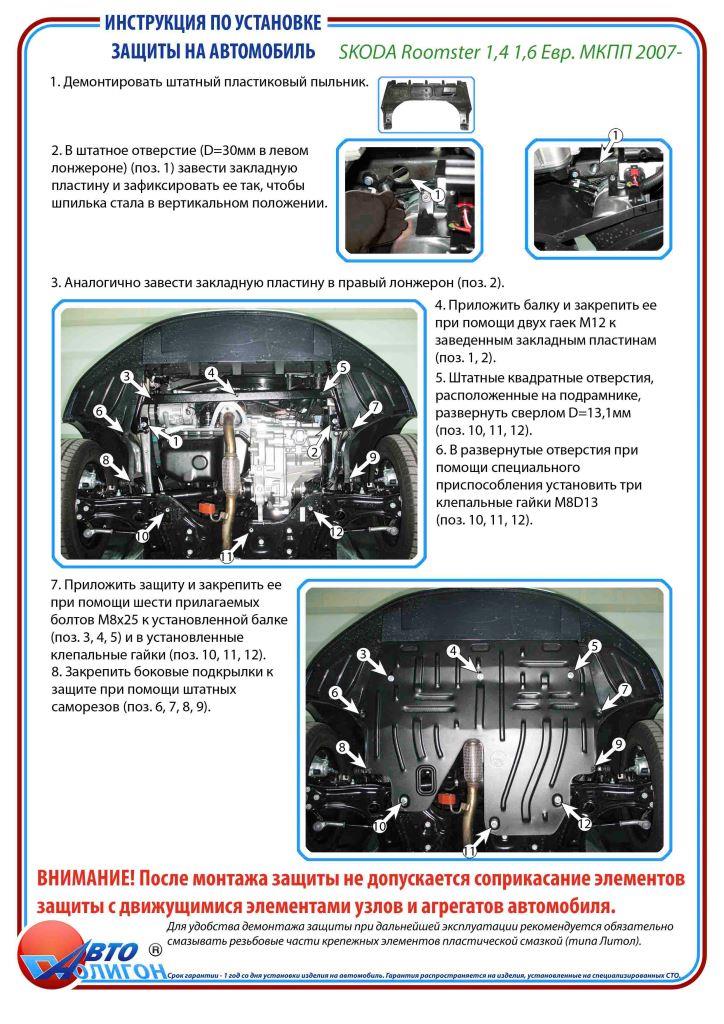 Цей захист двигуна індивідуально розроблений за параметрами моторного відсіку для автомобіля SKODA Roomster , модельного ряду років 2007 - 2021. Наприклад, якщо автомобіль випущений у 2007, 2008, 2009, 2010, 2011, 2012, 2013, 2014, 2015, 2016, 2017, 2018, 2019, 2020, 2021 роках, то можете бути упевнені, що цей захист двигуна підійде для Вашого автомобіля Roomster 1,4 1,6 Євр. МКПП.