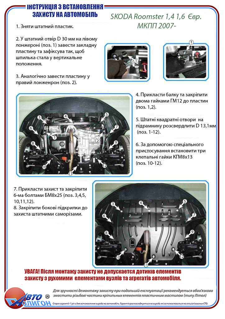 SKODA Roomster 1,4 1,6 Євр. МКПП 2007- Захист моторного відсіку та КПП
