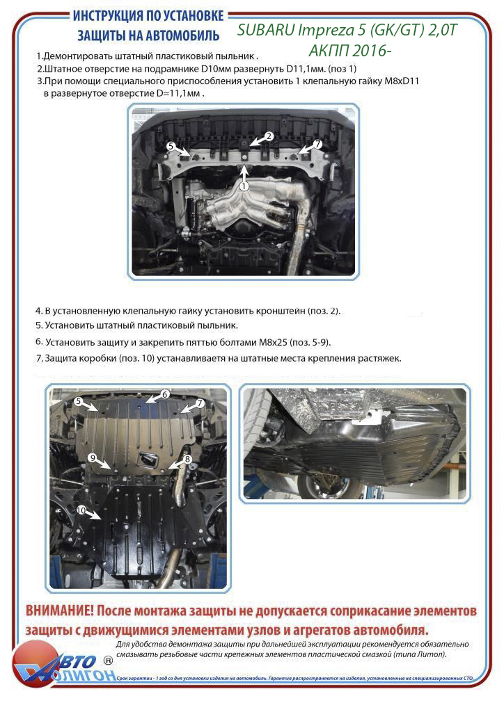 Цей захист двигуна індивідуально розроблений за параметрами моторного відсіку для автомобіля SUBARU Impreza 5 , модельного ряду років 2016 - 2022. Наприклад, якщо автомобіль випущений у 2016, 2017, 2018, 2019, 2020, 2021, 2022 роках, то можете бути упевнені, що цей захист двигуна підійде для Вашого автомобіля Impreza 5 (GK/GT) 2,0Т АКПП.
