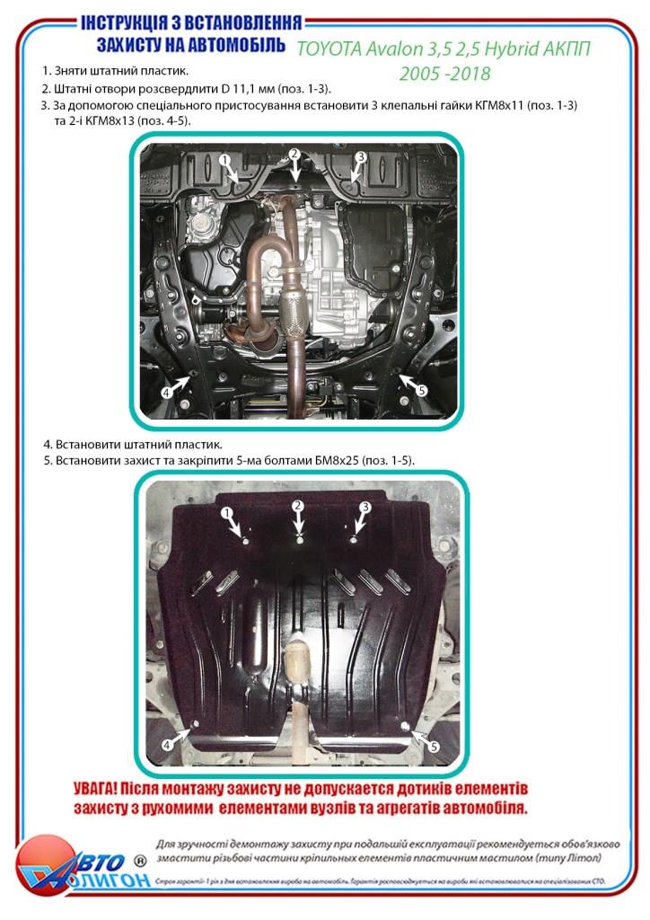 TOYOTA Avalon 3,5 2,5 Hybrid АКПП 2005-2018 Захист моторного відсіку та КПП
