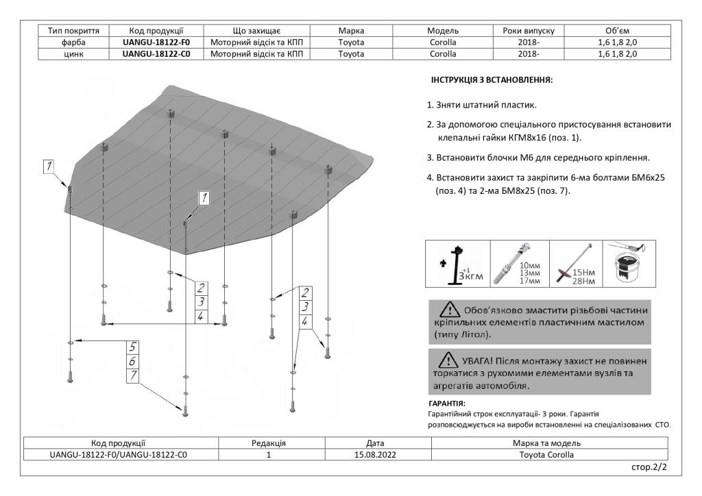 Цей захист двигуна індивідуально розроблений за параметрами моторного відсіку для автомобіля TOYOTA Corolla , модельного ряду років 2018 - 2021. Наприклад, якщо автомобіль випущений у 2018, 2019, 2020, 2021 роках, то можете бути упевнені, що цей захист двигуна підійде для Вашого автомобіля Corolla 1,6 1,8 2,0 + USA АКПП/МКПП.