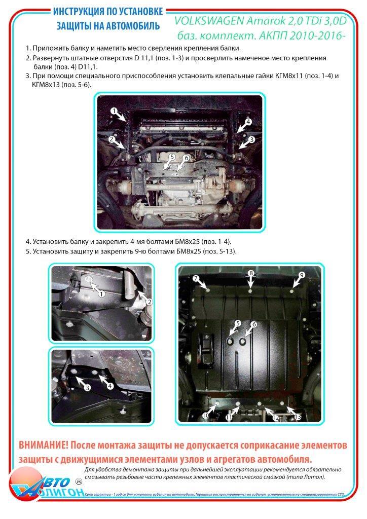 Цей захист двигуна індивідуально розроблений за параметрами моторного відсіку для автомобіля VOLKSWAGEN Amarok , модельного ряду років 2010 - 2022. Наприклад, якщо автомобіль випущений у 2010, 2011, 2012, 2013, 2014, 2015, 2016, 2017, 2018, 2019, 2020, 2021, 2022 роках, то можете бути упевнені, що цей захист двигуна підійде для Вашого автомобіля Amarok 2,0 TDi 3,0D базова комплектація АКПП.