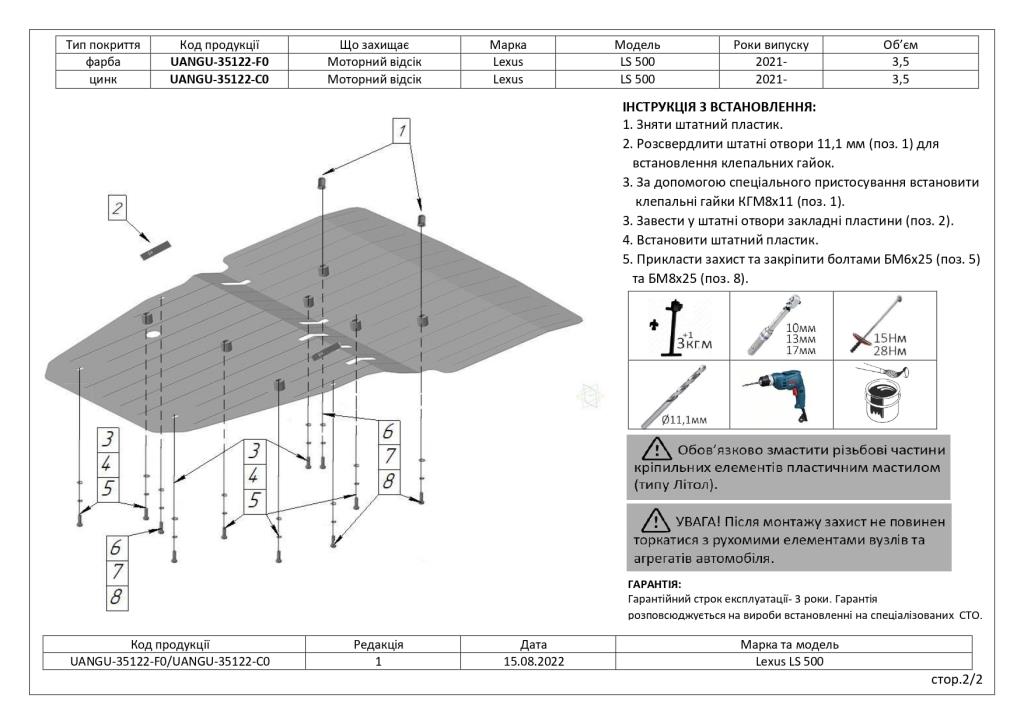 Эта защита двигателя индивидуально разработана по параметрам моторного отсека для автомобиля LEXUS LS 500h, модельного ряда лет 2017 - 2022. Например, если автомобиль выпущен в 2017, 2018, 2019, 2020, 2021, 2022 годах, то можете быть уверены, что эта защита двигателя подойдет для вашего автомобиля LS 500h 3,5 4x4 АКПП .
